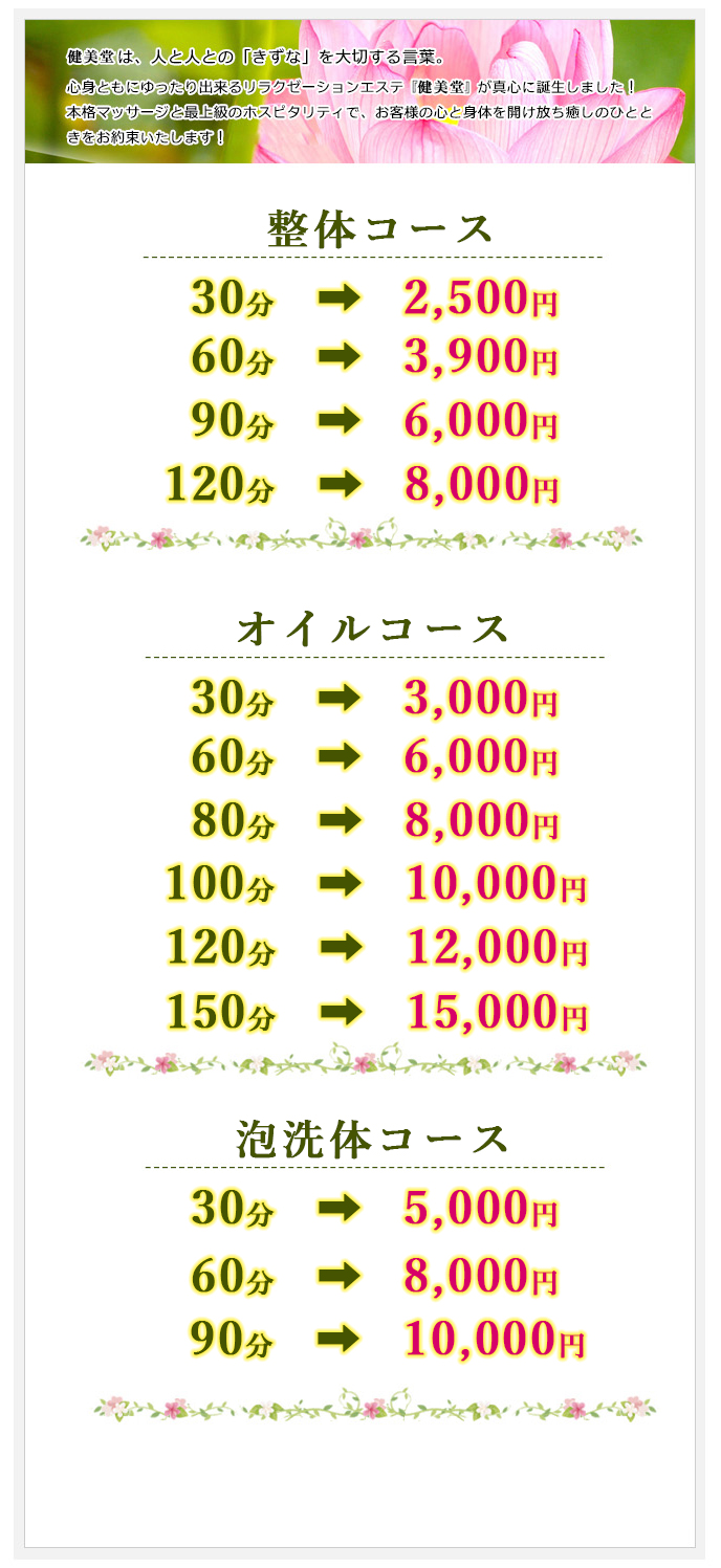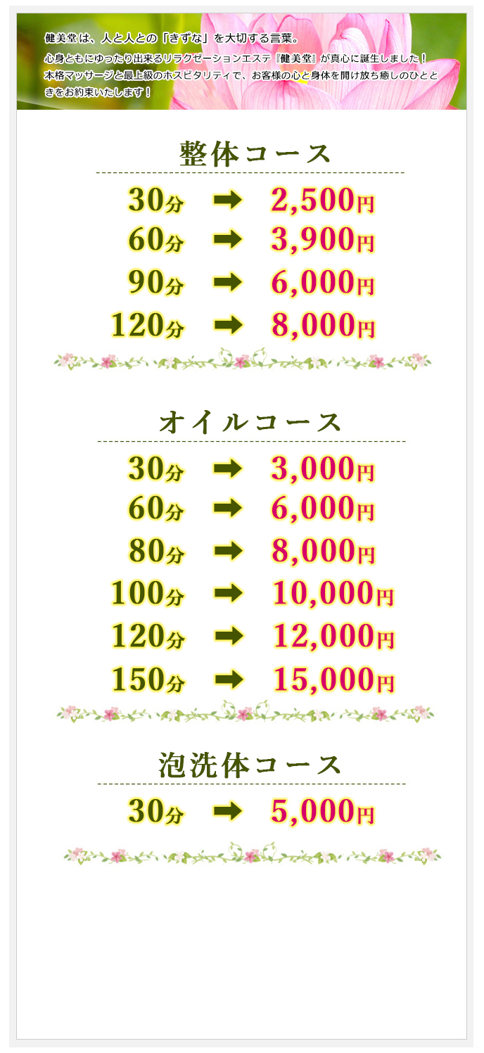 当店はアロマオイルを主体にしたリラクゼーションサロンでございます。日々の肉体的な疲れを全身指圧マッサージとアロマオイルマッサージを用いて、筋肉の疲労をケアし、疲れを少しでもご解消いただけますよう精一杯マッサージさせて頂きます。